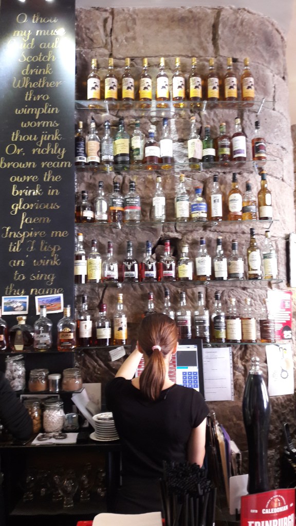 Un locale che consiglio con entusiasmo per la bontà del cibo, la gentilezza e precisione del servizio e per essere caratteristico senza diventare impersonale. La spesa è in linea con i prezzi medi di Edimburgo per un light lunch, a patto di stare lontani dall’altro elemento tipico del ristorante: il whisky. Bevo pochissimi alcolici e mai a pranzo, quindi non so cosa possa costare un passaggio da una delle infinite bottiglie del locale.
